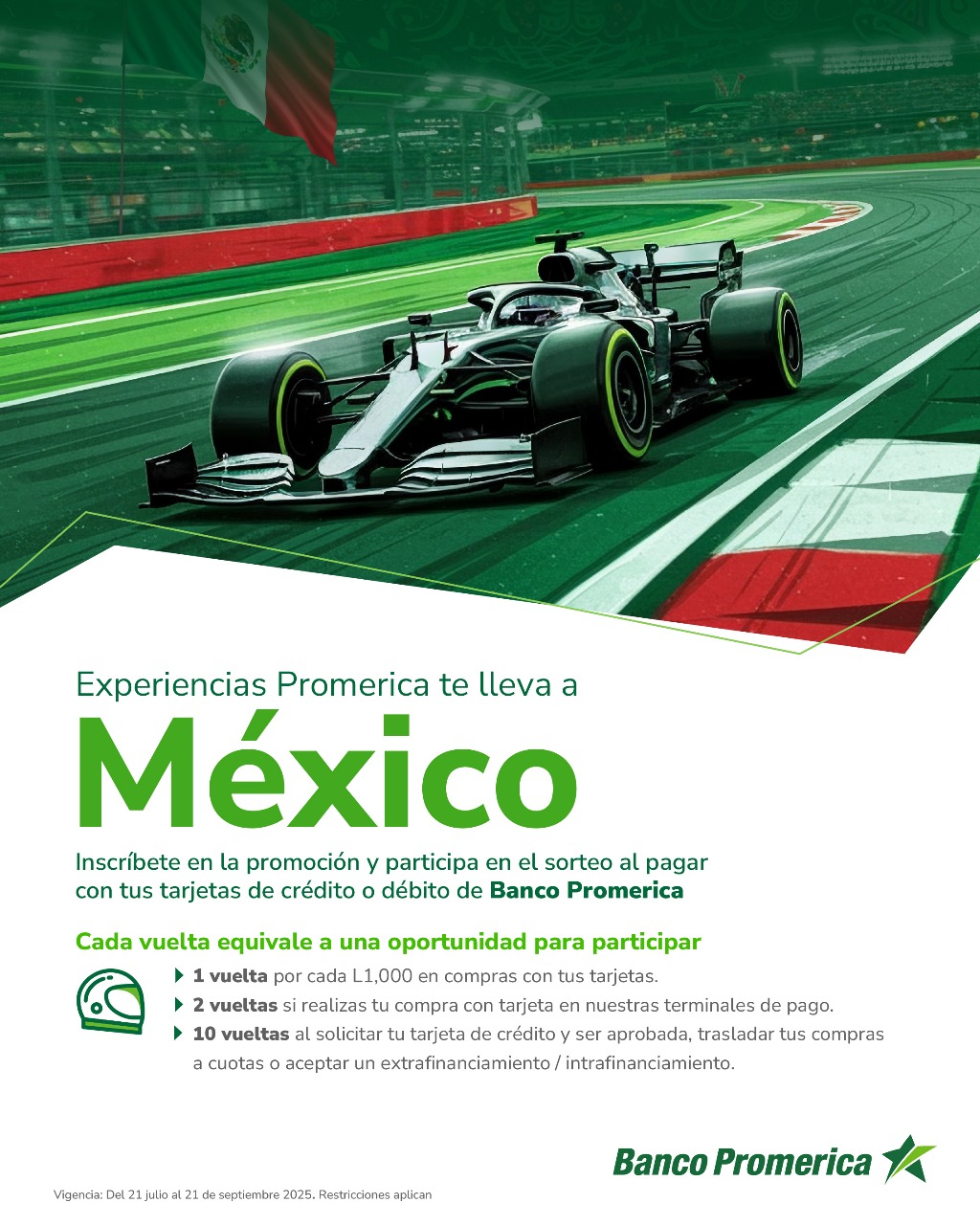 En el marco del décimo aniversario de Experiencias Promerica, Grupo Promerica lanza su promoción: “Experiencias Promerica te lleva a México”, una oportunidad única para que sus tarjetahabientes participen por un viaje inolvidable donde experimentaran del deporte de alta velocidad. La promoción estará vigente del 21 de julio al 21 de septiembre de 2025.