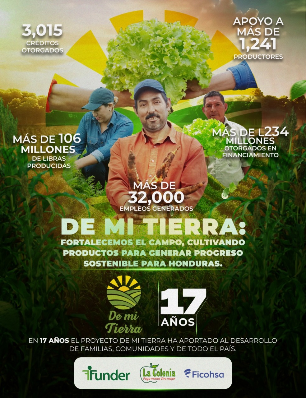 Supermercados La Colonia, Banco Ficohsa y Funder reafirman con orgullo su promesa de seguir caminando junto a los agricultores hondureños, verdaderos héroes que con sus manos siembran vida y esperanza para todo el país. Durante 17 años, De mi Tierra ha sido la prueba de que cuando los hondureños se unen, los sueños germinan y las comunidades florecen. Hoy, la visión es más clara que nunca: seguir inspirando, creciendo y construyendo un futuro donde cada cosecha sea sinónimo de dignidad, prosperidad y esperanza compartida.