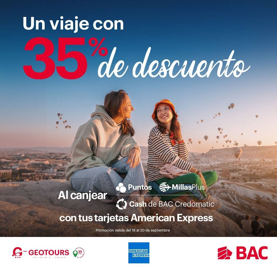 • 35% de descuento al redimir Millas Plus y Puntos BAC en las tarjetas American Express® de BAC Honduras del 18 al 20 de septiembre, en las oficinas de Geotours a nivel nacional.