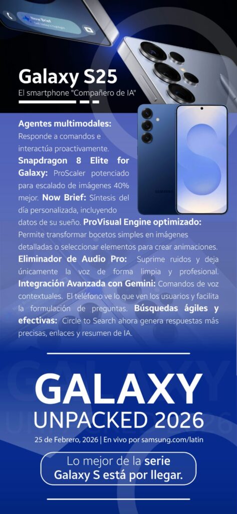 Samsung no solo compite, sino que se adelanta al futuro. El compromiso de la marca por ofrecer dispositivos disruptivos tendrá su próximo gran capítulo el 25 de febrero de 2026 en el Galaxy Unpacked. La integración de la IA se elevará a una dimensión nunca antes vista, transformando radicalmente la interacción humana con la tecnología. El futuro no se espera, se vive con Galaxy.