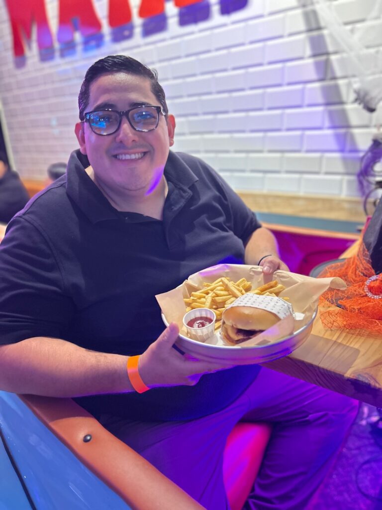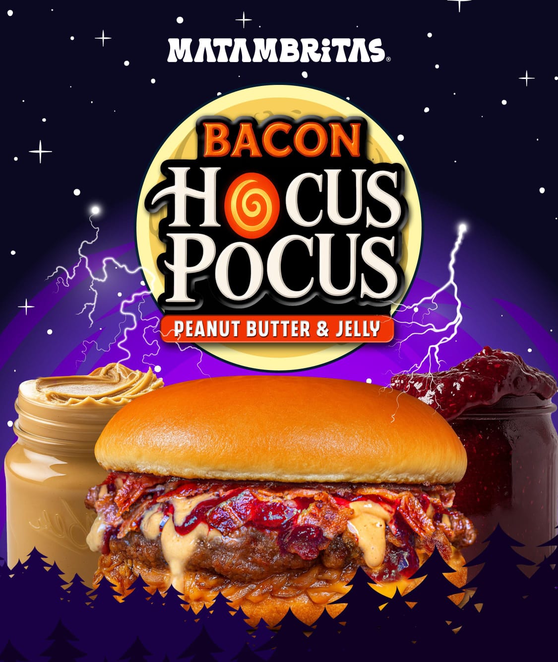 La hamburguesa Hocus Pocus combina ingredientes audaces que parecen salidos de un caldero mágico: mermelada de frutos del bosque, mantequilla de maní, crujiente tocino y una jugosa carne Smash. El resultado es un contraste perfecto entre lo dulce, lo salado y lo crujiente —una explosión de sabor que sorprende desde el primer bocado.