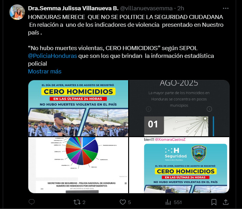 Villanueva reaccionó en la red social X a un informe que, según el ministro de Seguridad, Gustavo Sánchez, refleja que en tres ocasiones durante los últimos diez días no se registraron muertes violentas. “Como quisiera que fuera cierto. Intolerable que se politice un tema tan delicado. Las muertes violentas ocurren todos los días”, escribió la funcionaria.